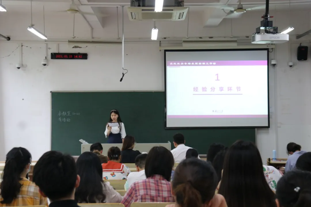 就职于党政机关的两位优秀毕业生——祁恒学长、黄雨蓓学姐对同学们进行求职实训的经验分享与无领导小组面试指导。活动由院研会实践部徐金婷同学主持。