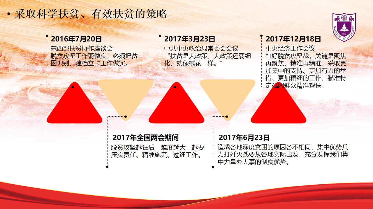 关于如何进行有效扶贫的问题上,储馨竹指出,扶贫干部坚守岗位落实工作,她进一步阐述道,“习总书记在中央扶贫开发工作会议上指出越是进行脱贫攻坚战,越是要加强和改善党的领导。我们必须明确脱贫攻坚是一场硬仗,越到最后越要紧绷这根弦,不能停顿、不能大意、不能放松”。在第四部分“采取科学扶贫、有效扶贫的策略”,储馨竹指出要坚持精准扶贫、精准脱贫,重在提高脱贫攻坚成效,并简要说明了“六个精准”的内涵,即扶持对象精准、项目安排精准、资金使用精准、措施到户精准、因村派人(第一书记)精准、脱贫成效精准。最后,储馨竹引用习总书记于2020年12月3日在中共中央政治局常委会会议上的讲话作为发言结尾,再次总结我国脱贫攻坚工作取得的重大胜利,点明中国共产党攻坚克难、不负人民的决心。
