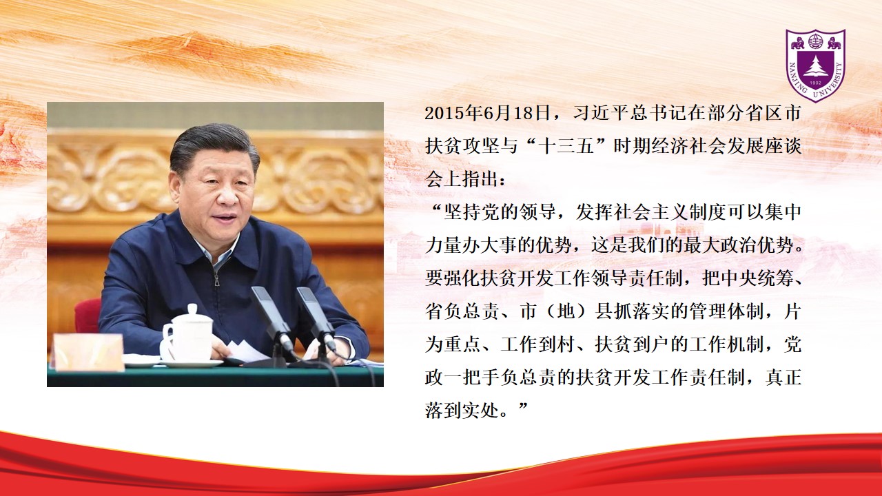 随后,储馨竹从“发展为了人民”“发展依靠人民”“扶贫干部坚守岗位落实工作”和“采取科学扶贫、有效扶贫的策略”四个方面展开论述。我党不忘初心,始终牢记发展为了人民。从十八大提出到2020年全面建成小康社会目标开始,习近平总书记多次前往贫困地区实地调研,带领全国人民共同打赢脱贫攻坚战。储馨竹强调,发展依靠人民。扶贫开发是全党全社会的共同责任,要动员和凝聚全社会力量广泛参与。2014年首个扶贫日暨全国脱贫攻坚表彰会上习近平总书记作出重要批示指出,这对于弘扬中华民族扶贫济困的传统美德,培育和践行社会主义核心价值观,动员社会各方面力量共同向贫困宣战,继续打好扶贫攻坚战具有重要意义。往后数年的脱贫攻坚座谈会中,习近平总书记也多次作出东西部扶贫协作、政府和社会两方面力量共同参与等重要论述。