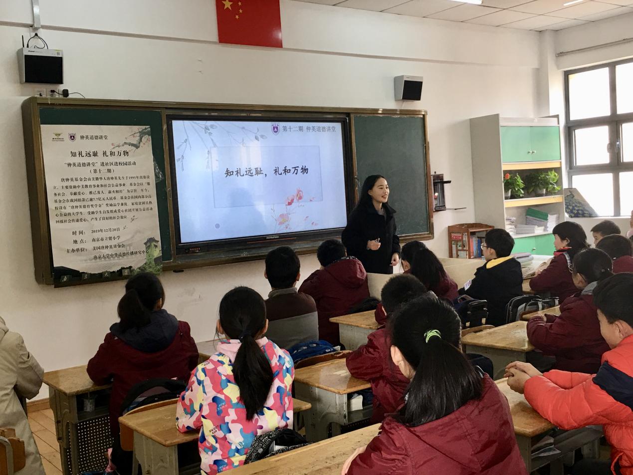 第十二期“仲英道德讲堂”进社区进校园活动于南京市立贤小学拉开帷幕。本次中华优秀传统道德讲堂活动以“知礼远耻,礼和万物”为主题,南京市立贤小学40余名师生踊跃参与其中,学习优秀传统礼仪,感悟中华文化魅力。