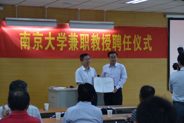 院长王明生授予李程骅教授兼职教授聘任书并佩戴南大校徽。