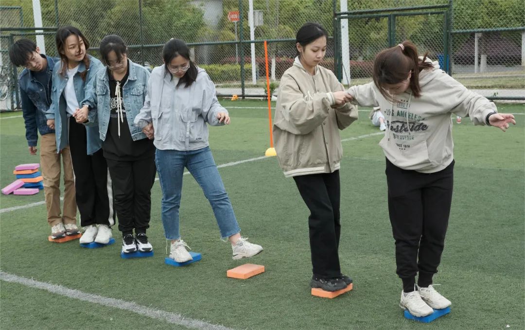 最考验团队配合的游戏是今年的新晋游戏——搭桥过河齐前进。6个人,7块砖,20米河流。如何更安全、更快地实现全员过河,可难住了不少参赛队伍。紧张的练习时间,有趣的头脑风暴,不断冲击着搭桥过河的记录。2021级本科班将时间控制在6分钟以内,远超其他参赛队伍,再次夺魁。