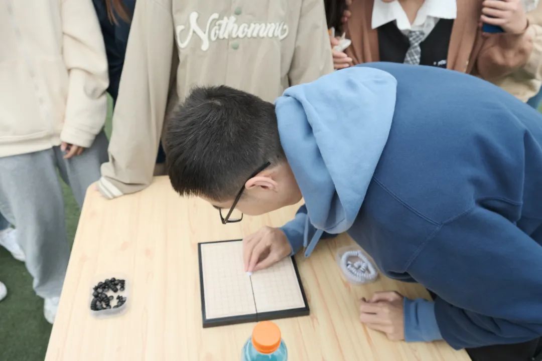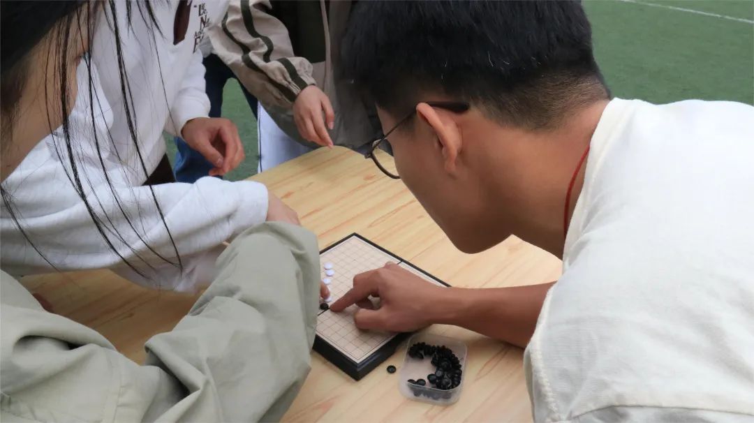 快乐的时间总是如此短暂,比赛来到一决胜负的最后一个项目——智慧接力五子棋。这个项目顾名思义,是对智力与体力的双重考验。与普通的五子棋比赛不同,这次比赛要求参赛选手在转圈和奔跑后才能进行落子,还需返回与队友进行击掌接力。作为压台项目,同学们纷纷聚集在棋桌旁围观、加油、指点,期待着见证最后的胜利者产生。最终,2021级硕士一班经过3轮比赛夺得了胜利。