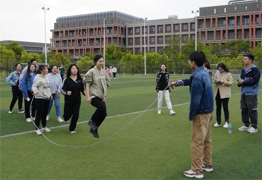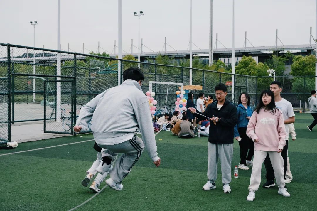 下面,我们来到“绳”采飞扬跳大绳项目。这是一项考验速度、技巧与团队默契的运动。但运动员们矫健的身影,轻盈的跳跃,伴随着跳绳砸地的有序声响,共同谱写着一曲青春的赞歌。2021级本科班与2022级硕士一班之间的较量相当激烈,分别取得两分钟87跳与80跳的好成绩。第一名由2021级本科班收入囊中。