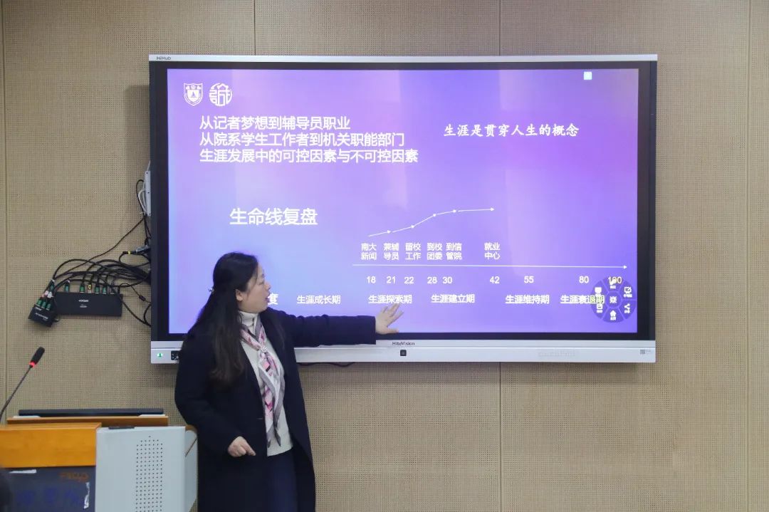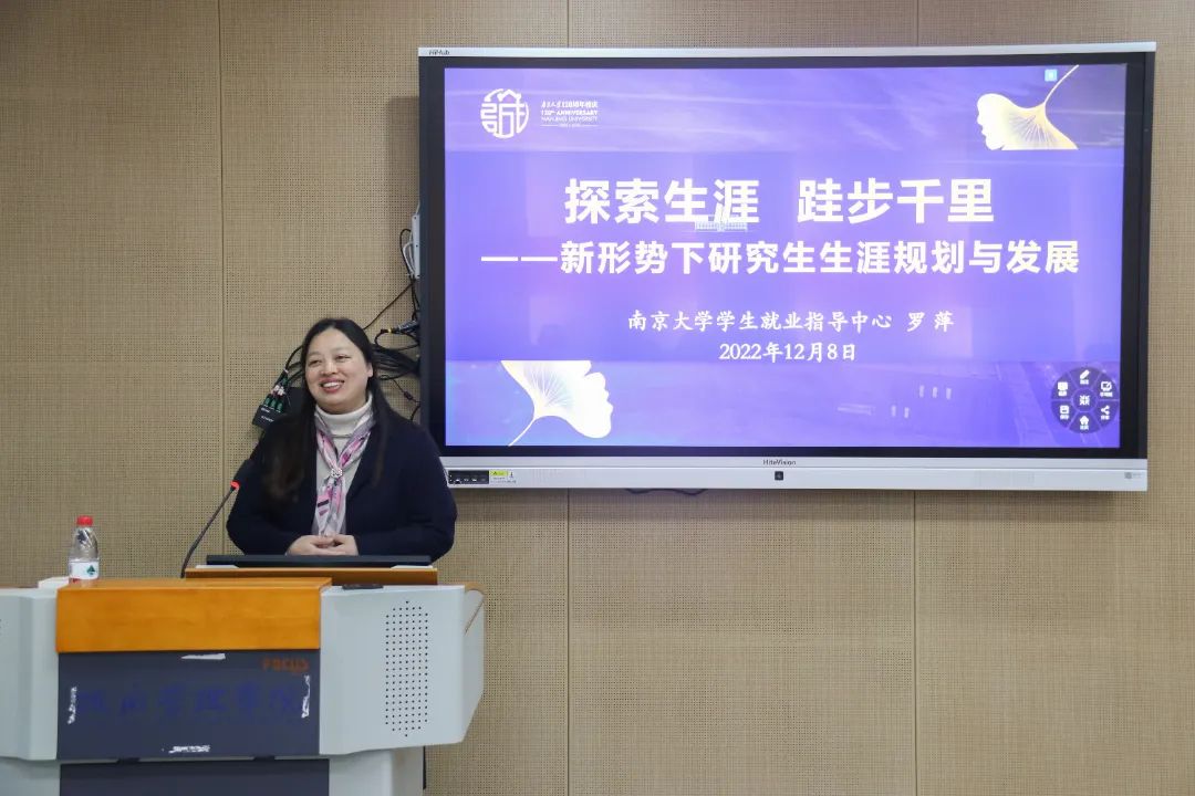 团委书记、辅导员刘晶月老师主持。罗萍老师以“新形势下研究生生涯规划与发展”为主题,为研一同学提供当今时代下的就业形势分析和生涯规划指导,帮助同学们找准自身定位、促进潜能激发。