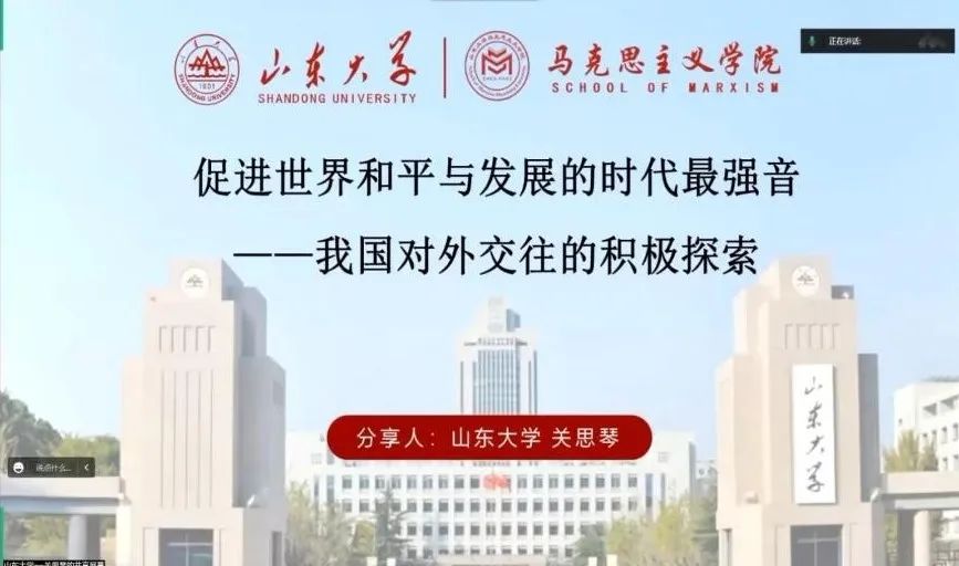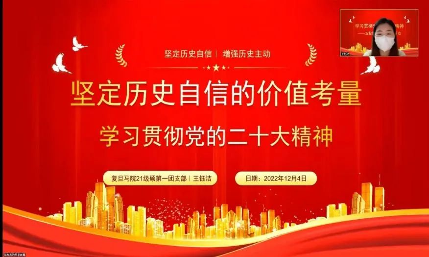 2021级硕士生第一团支部邱友亮同志主持,五个支部相聚“云端”围绕党的二十大依次进行主题分享。