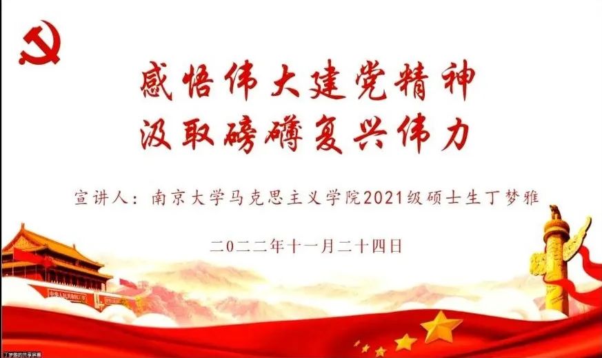 2021级硕士生第一团支部丁梦雅同志作《感悟伟大建党精神,汲取磅礴复兴伟力》主题分享,讲述了中国共产党人在黑暗中追逐信仰之光,在绝境中坚定理想信念故事。他们以鲜血践初心,以生命担使命,将“对党忠诚,不负人民”的誓言播撒在祖国每一片大地上,凝聚起“虽九死其犹未悔”的奉献之力。深刻领悟并践行伟大建党精神是我们建功新时代、奋进新征程,以中国式现代化实现中华民族伟大复兴的中国梦的必然要求。