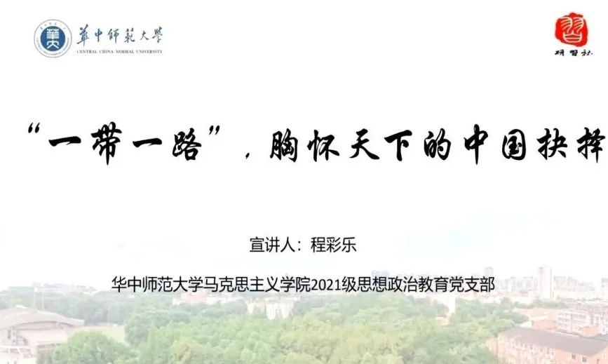2021级思想政治教育党支部程彩乐同志作《“一带一路”,胸怀天下的中国抉择》主题分享,指出共建“一带一路”传递的是希望,追求的是发展,崇尚的是共赢。“一带一路”是古丝绸之路的延续,是各国人民谱写幸福美好生活的篇章。走过百年筚路蓝缕、求索奋进的伟大征程,“一带一路”的倡议映射出中国共产党人对人类发展和命运前途的担当,中国共产党将继续为中国人民谋幸福,为中华民族谋复兴,为世界谋大同。