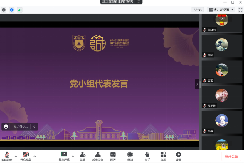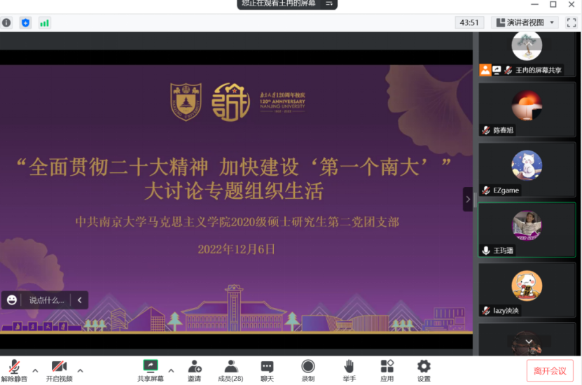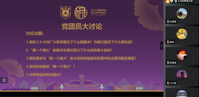 建设中肯的建议。经过本次热烈而有效的讨论,2020级研究生第二党支部、团支部全体同学们形成共识:即使临近毕业,也必将为建设“第一个南大”贡献作为南大学子的青春之力。