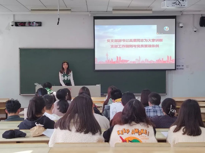 开场过后,由党支部副书记吴童同学为大家讲解支部工作细则和党员管理条例,进一步加强了党支部标准化、规范化建设,提高了党支部建设质量。