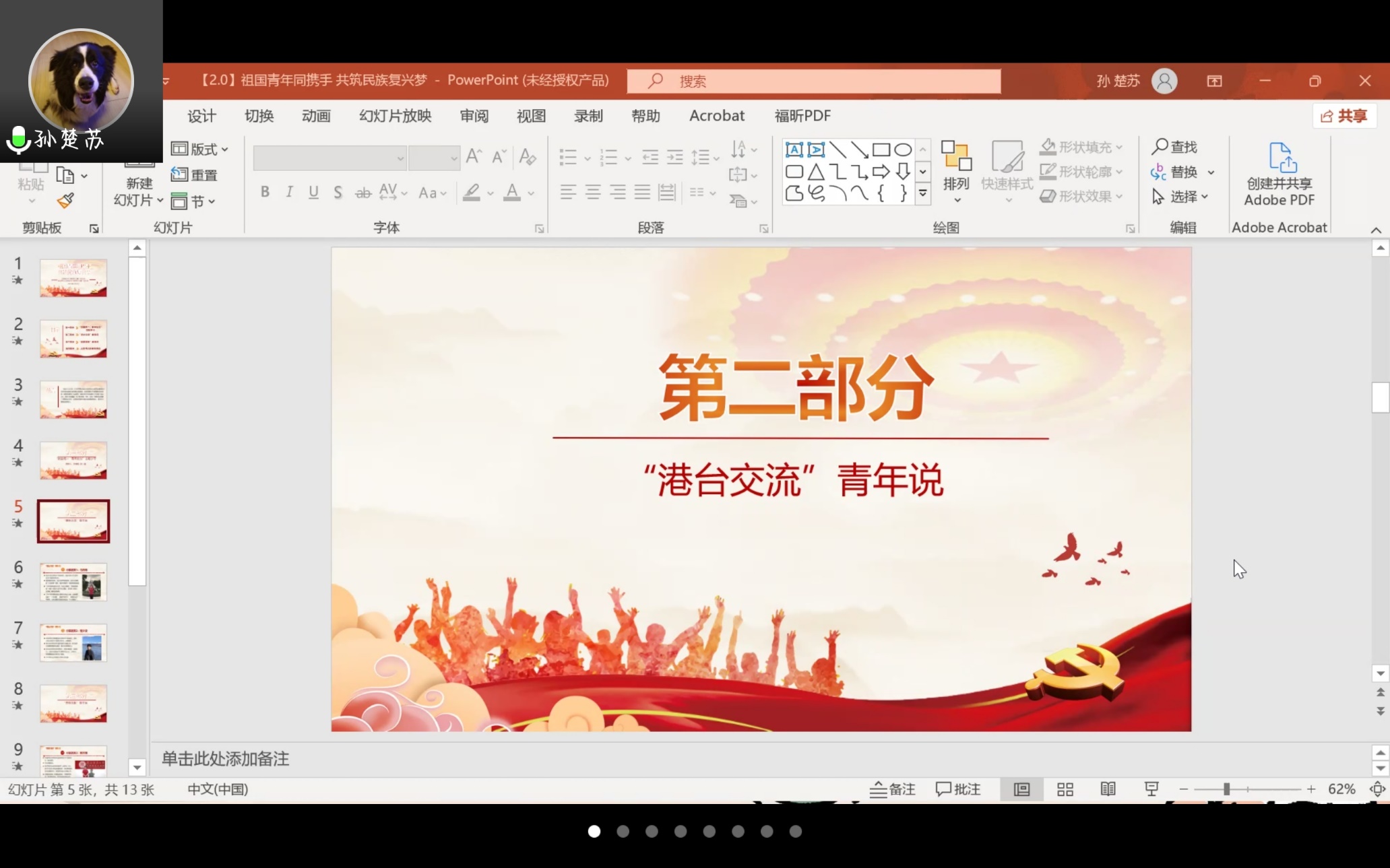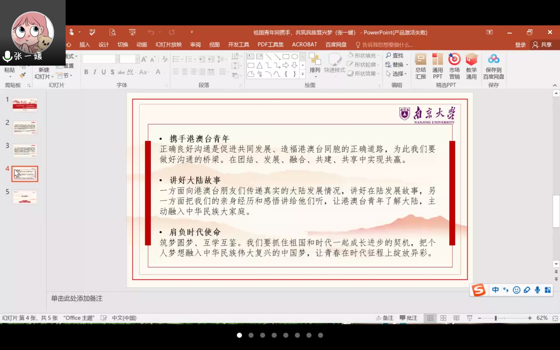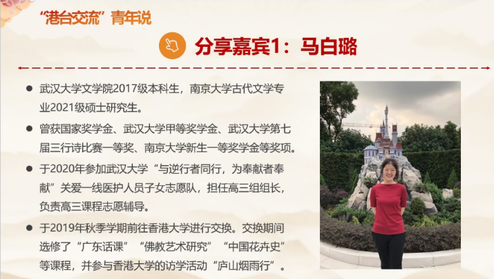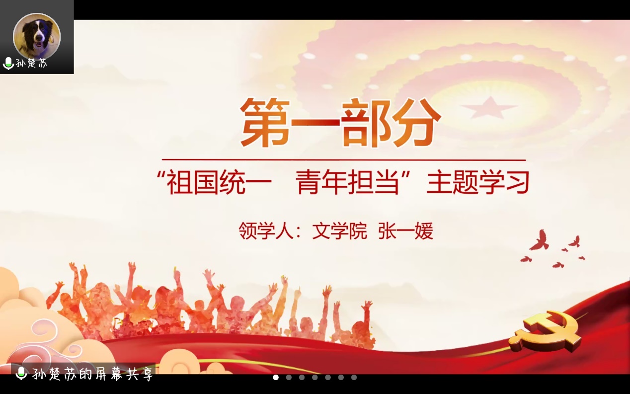 2021级硕士生第二党支部书记张一媛同学为带领同学们进行“祖国统一,青年担当”主题学习。张一媛同学通过短视频与大家一同回顾了习近平总书记的香港之行,并重温习总书记在庆祝香港回归祖国25周年大会的讲话以及7月11日给参加海峡青年论坛的台湾青年的回信精神,她提出三点倡议:一是携手港澳台青年,做好沟通的桥梁;二是讲好大陆故事,让港澳台青年了解大陆,主动融入中华民族大家庭;三是肩负时代使命,与港澳台青年筑梦圆梦、互学互鉴,把个人梦想融入中华民族伟大复兴的中国梦,让青春在时代征程上绽放异彩。