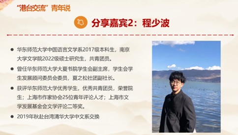 2022级硕士研究生程少波曾于2019年秋赴台湾清华大学中文系交换,虽然台湾的基础设施及学术研究与大陆存在一定差距,但他仍能真切感受到当前绝大部分台湾青年对大陆文化的殷切期待,对两岸团结统一的认可与支持,相信两岸青年能够进一步加强沟通与理解,共筑祖国美好未来。
