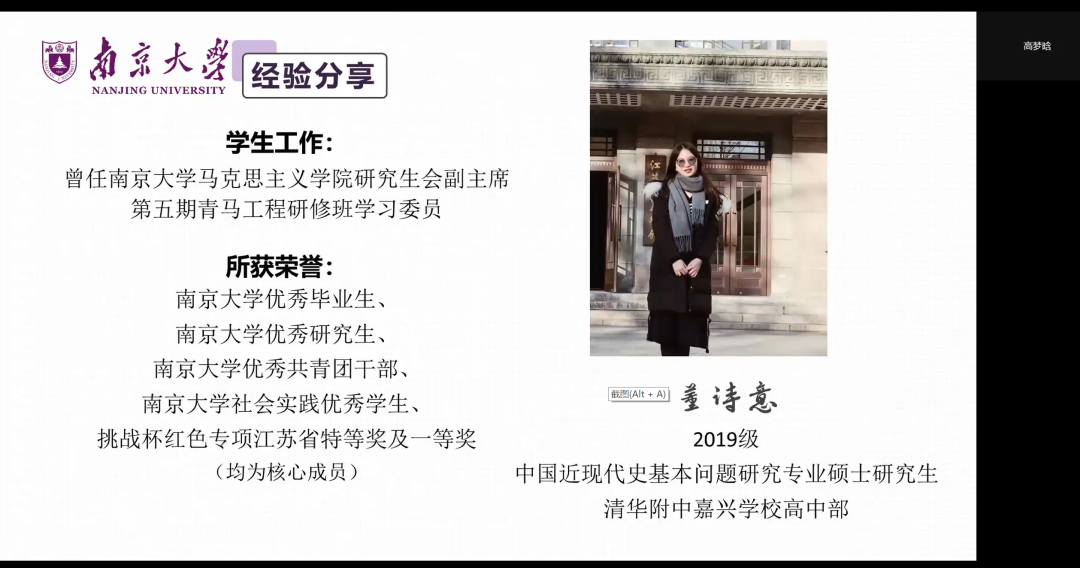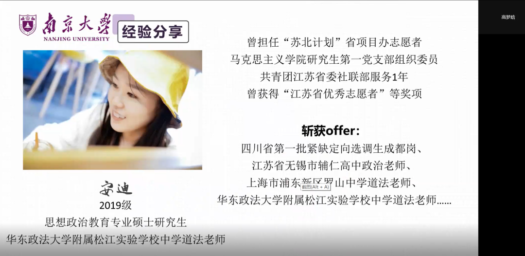 毕业生求职经验分享会之中学教师专场以在线会议的形式顺利举办。此次分享会共吸引来自各院系的50余名同学相聚云端,倾听学姐们选择中学教师职业的心路历程与经验分享。