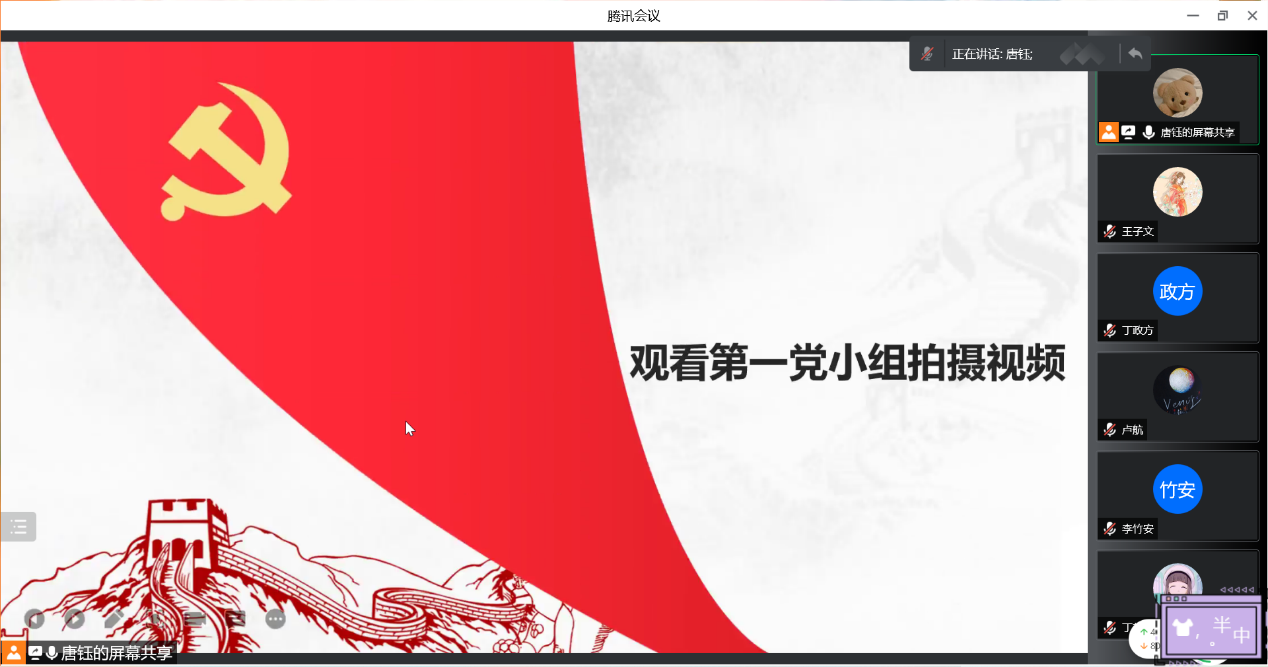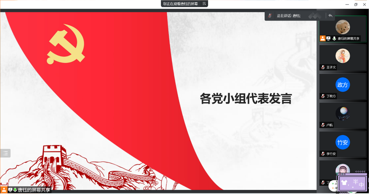 2021级硕士生第一党支部书记唐钰同志主持。活动主要分为四个环节,分别为博士生讲师团党课宣讲、第一党小组组织学习、各党小组学习讨论和视频展示。