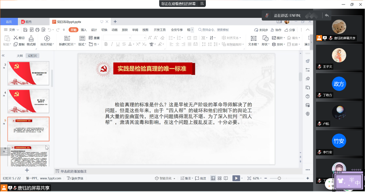 第二党小组的丁政方同志从“解放思想,实事求是”出发,阐明这是我党一以贯之的思想路线,她还结合现实问题,指出了“解放思想,实事求是”对于我们青年的意义,提出新时代我们应当坚持解放思想,树立创新意识,在生活和学习中脚踏实地,实事求是。